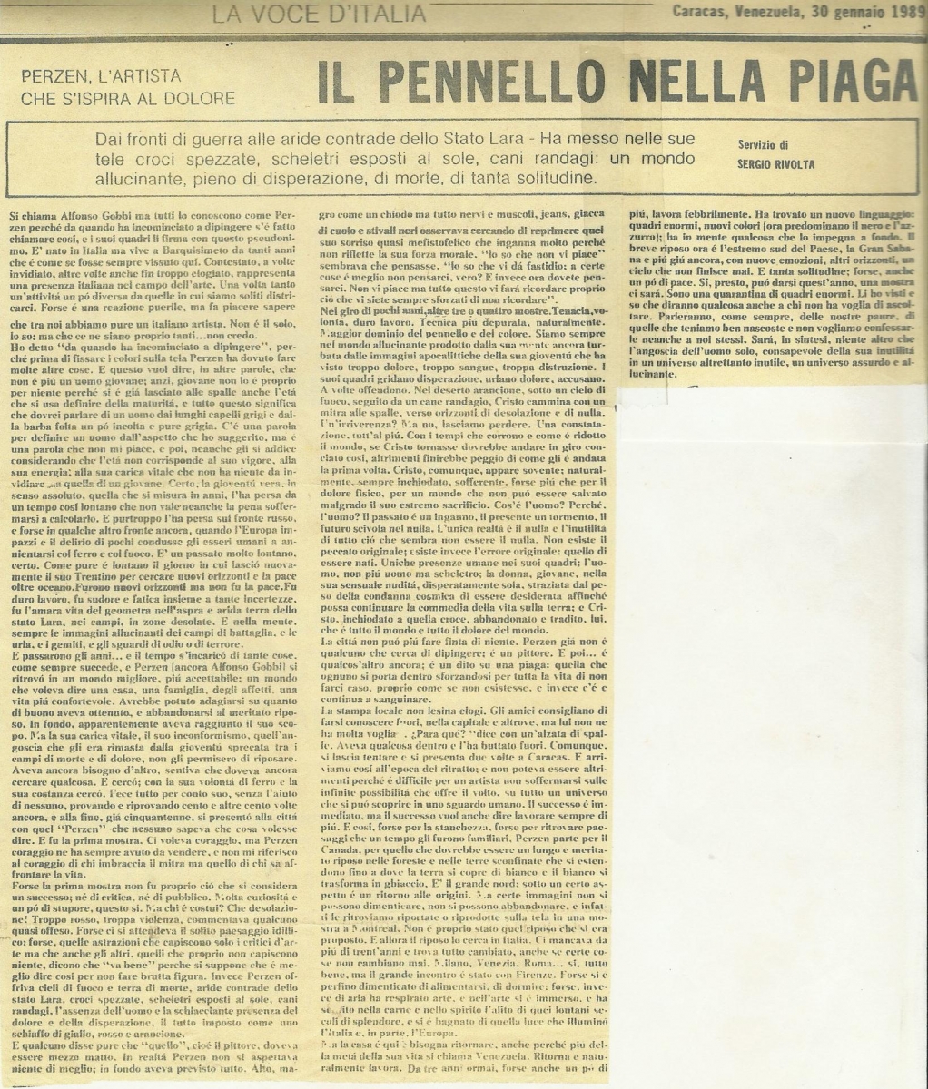 Articulo extraído del correo (periódico) “La Voce de Italia, Caracas, Venezuela, 30 de enero de 1989”. “El artista que se inspira en el dolor”